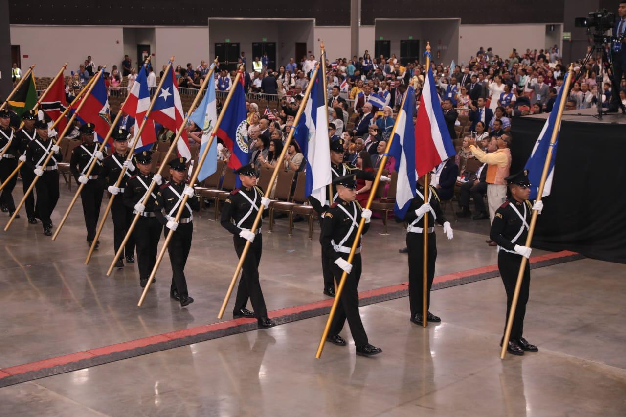 El acto protocolar inició con el ingreso de los emblemas de los países participantes, encabezado por la bandera panameña como país anfitrión la cual fue escoltada por unidades del Servicio de Protección Institucional (SPI) y dos empolleradas.