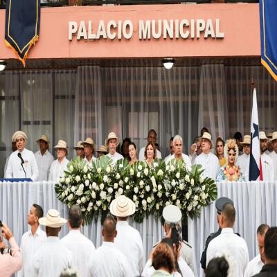 Junto a la primera dama, miembros de su Gabinete y autoridades locales, el presidente se dirigió al Palacio Municipal Justo Arosemena Medina, desde donde apreció el talento musical y el fervor patriótico de las bandas y delegaciones estudiantiles e institucionales.