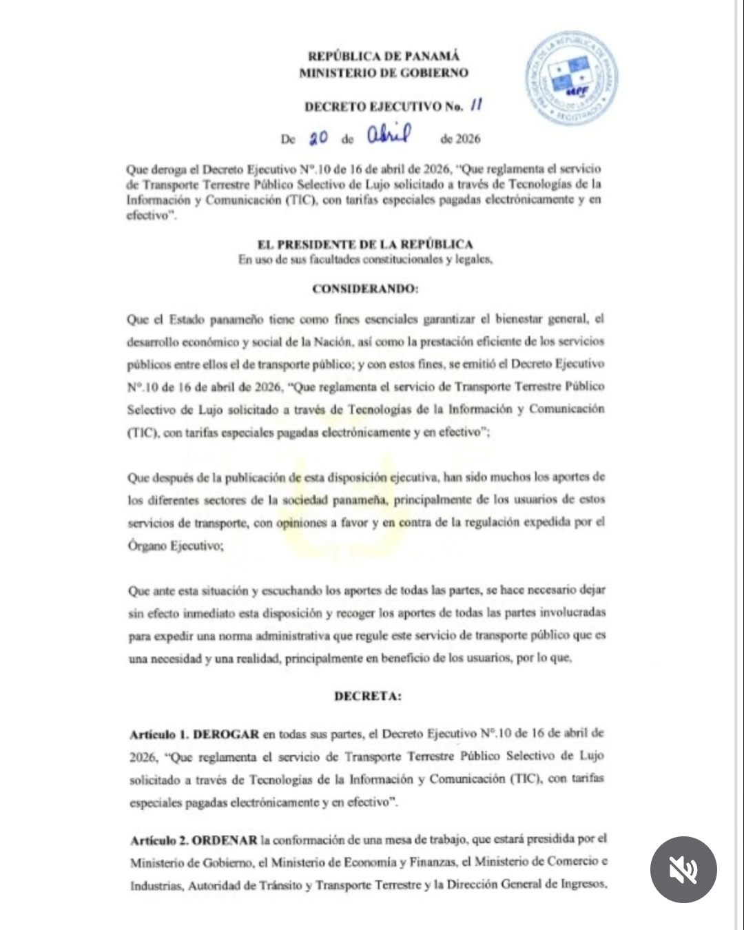 El Presidente de la República, José Raúl Mulino, derogó el Decreto Ejecutivo N.10 del 16 de abril de 2026 que reglamentaba el servicio de transporte público selectivo de lujo solicitado a través de tecnologías de la información y comunicación TIC, con el objetivo de abrir el tema a un periodo de consulta ampliada con todos los sectores involucrados.
